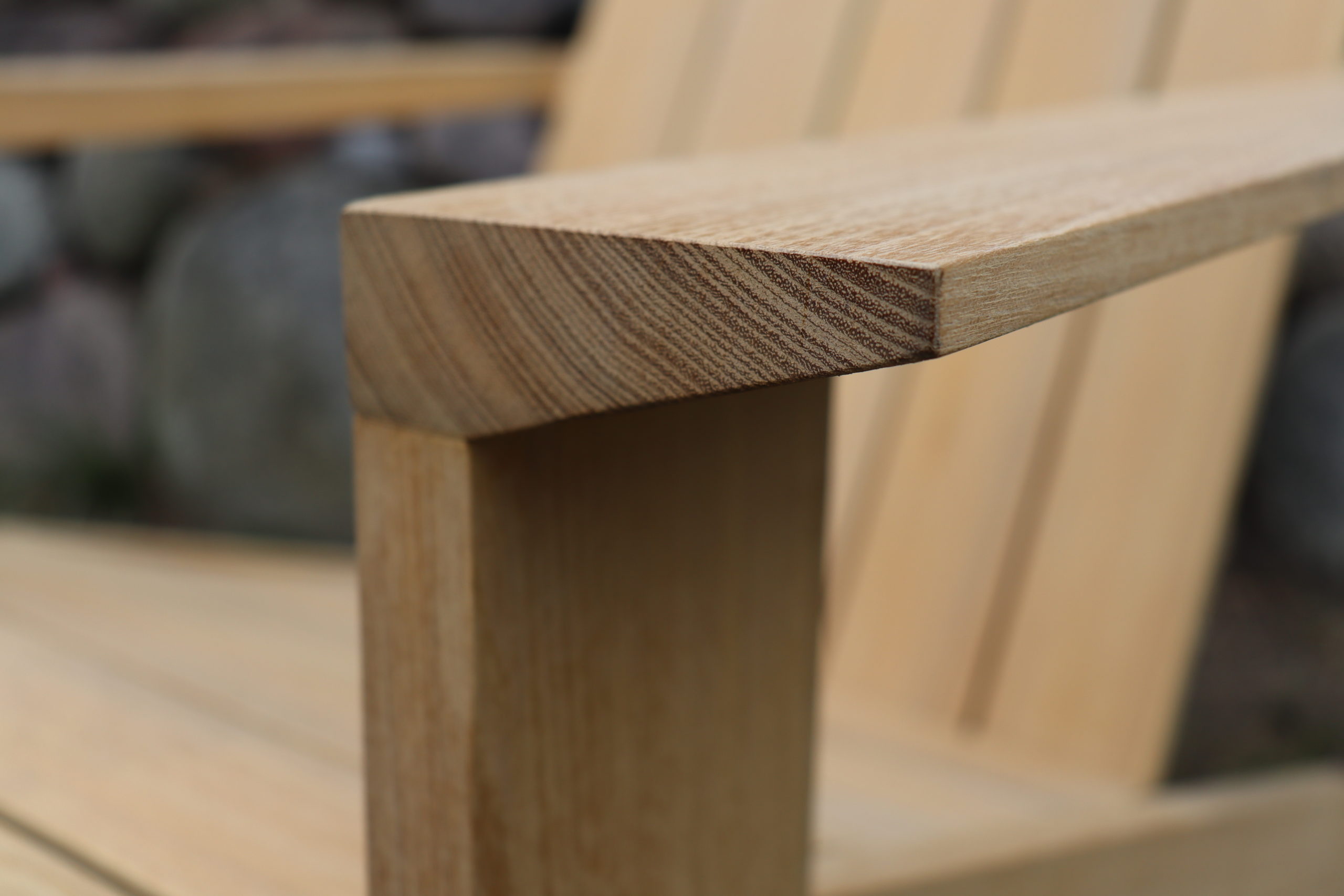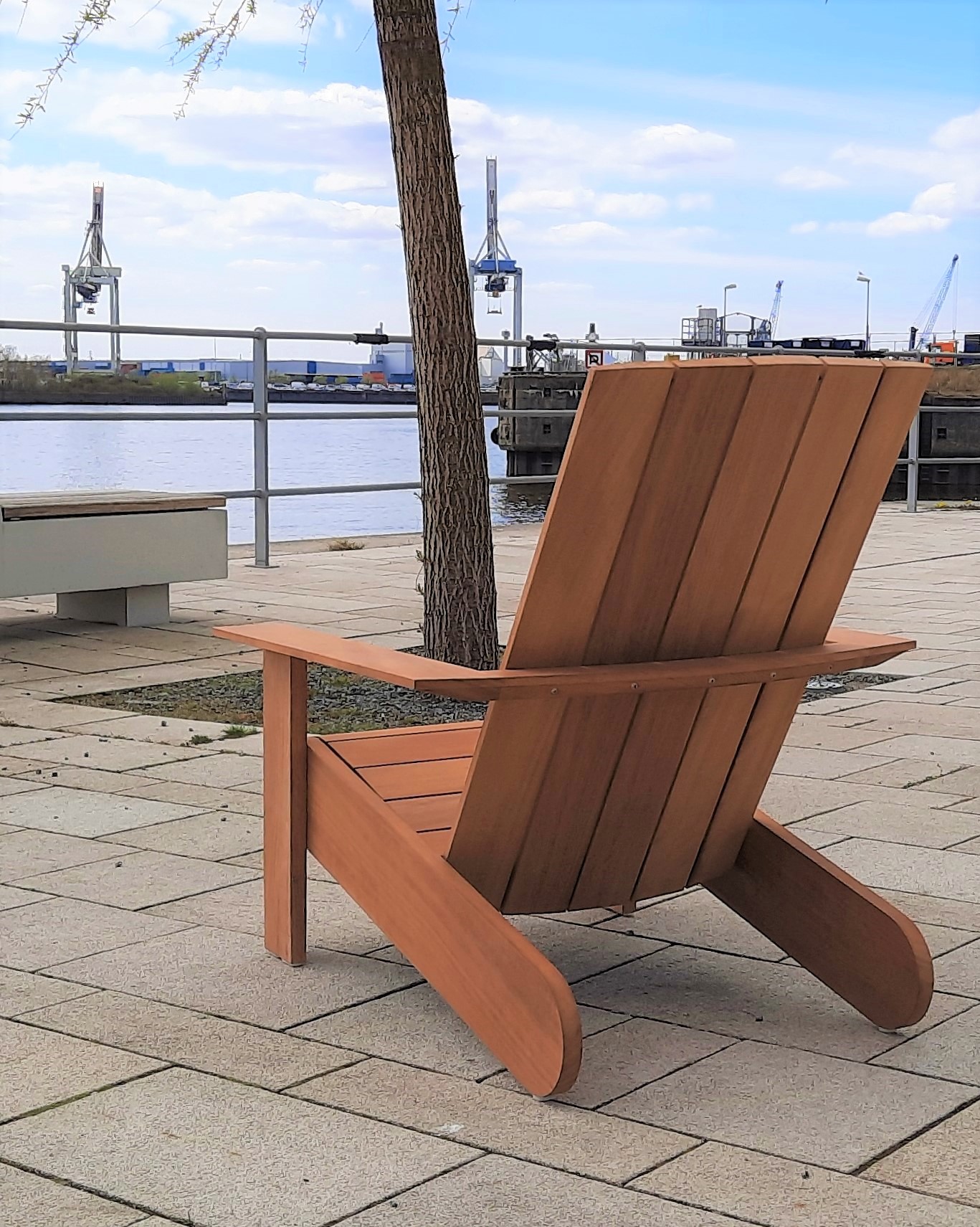 Er verbindet Design & Entspannung in einer modernen Form. Im Herzen ist er schon auch ein Adirondack Chair, mit dem typischen entspannten nach hinten geneigten Sitzen und den breiten Armlehnen, die bei ihm besonders schön gestaltet sind und zu Streicheleinheiten einladen – so wird Natur fühlbar!”